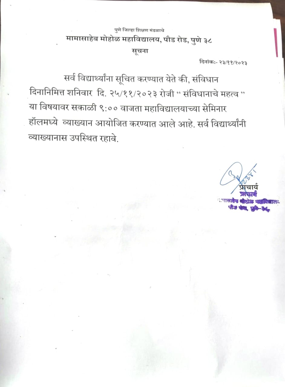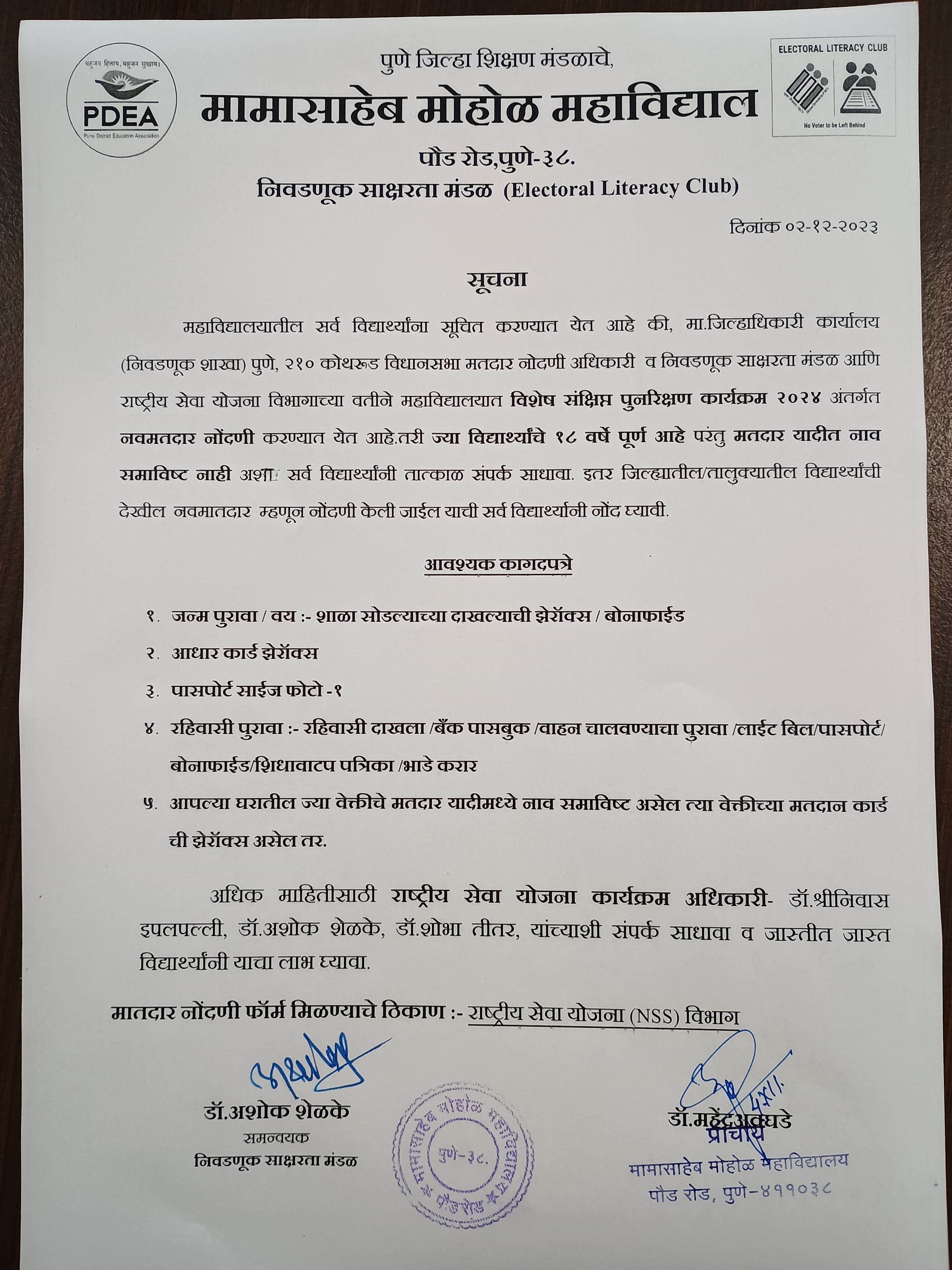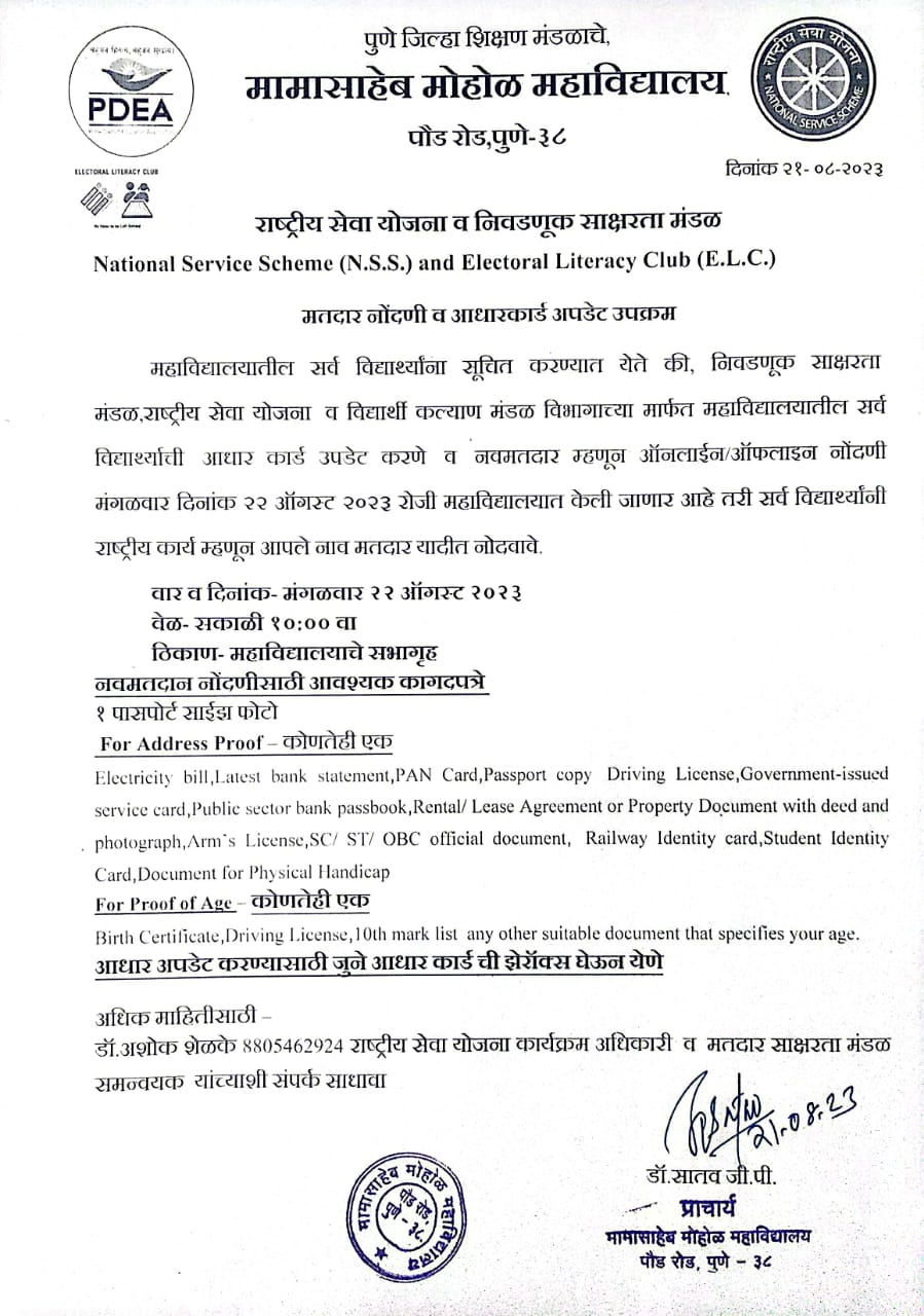 | 27 | नवीन मतदार नोंदणी | Updating Adhar ans registering for a voters ID | Social | NSS | All Students | Mamasaheb Mohol College | bring Address proof and Age proof | Dr. Satav .G.P. | 2023-08-21 | 08:00 AM | 2023-08-26 | 11:00 AM | New Voters Registration .jpeg |