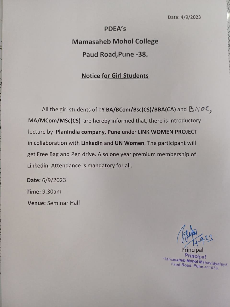 | 24 | Link Woman Project | Linkedin and UN Woman | Academic | PlanIndia | All Girl Students | Mamasaheb Mohol College | encourage woman empowerment and social reach | Dr. Satav .G.P. | 2023-09-06 | 09:30 AM | -- | :59 PM | linkWoman.jpeg |