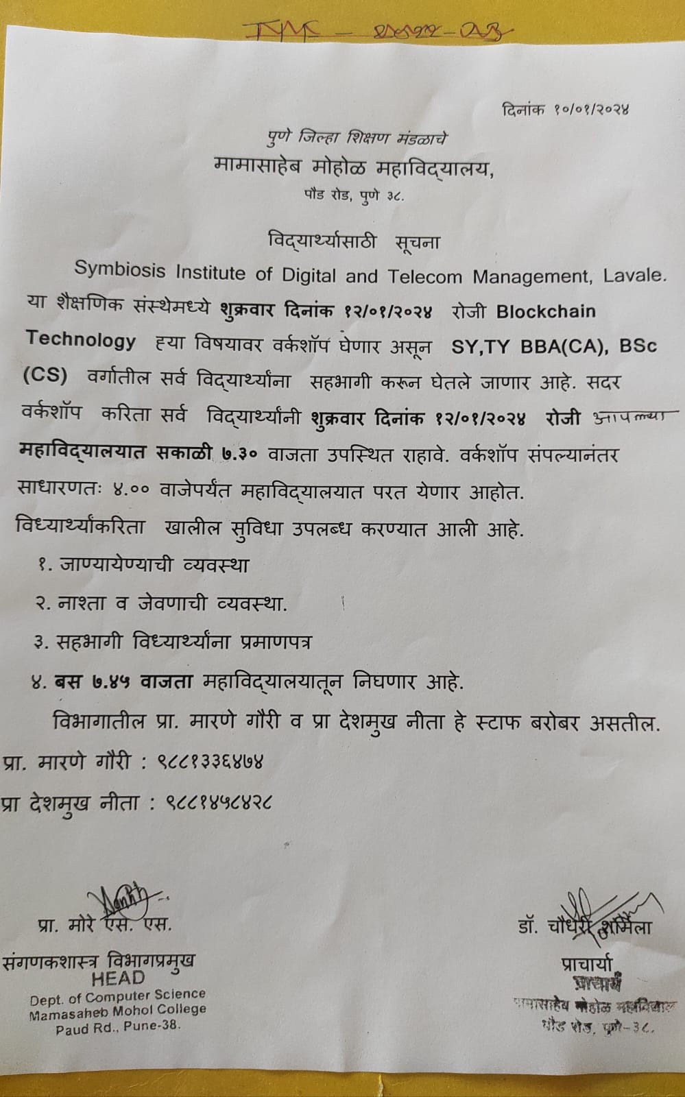 | 11 | Workshop on Blockchain Technology | Workshop on Blockchain Technology, in Symbiosis Institute of Digital and Telecom management, Lavale | Academic | -- | Students | MMC - Pune | SY, TY(BBA), BSc(CS) stay present at 7:30am on 12/01/2024 | Prof. Nita Deshmukh | 2024-01-12 | 07:30 AM | -- | 05:00 PM | WhatsApp Image 2024-01-13 at 11.18.11.jpeg |