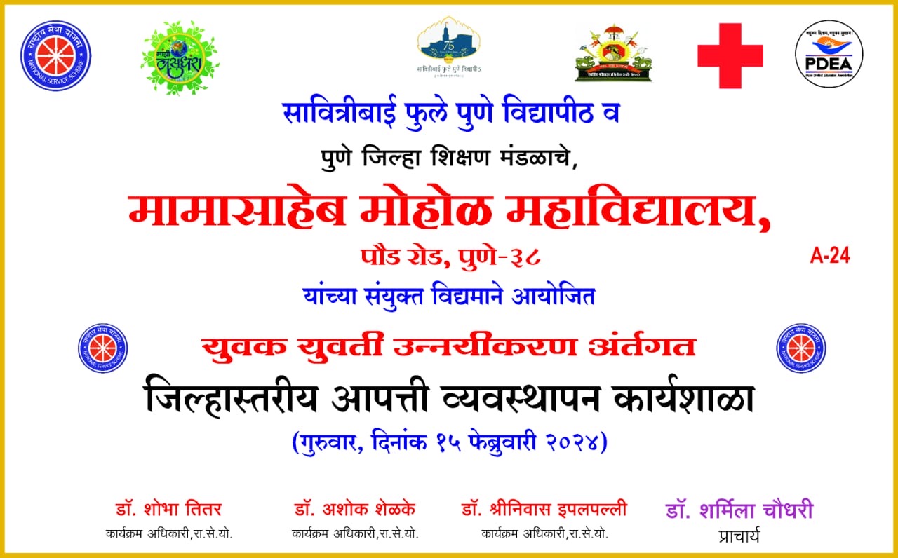 | 6 | Disaster management workshop | -- | Social | Dr. Sharmila Choudhari | Students NSS | Mamasaheb Mohol College | -- | Dr. Shelke | 2024-02-15 | 11:00 AM | -- | 01:00 PM | 39fe30c9-3d4e-444d-a8eb-fe0370e0c4d1.jpeg |