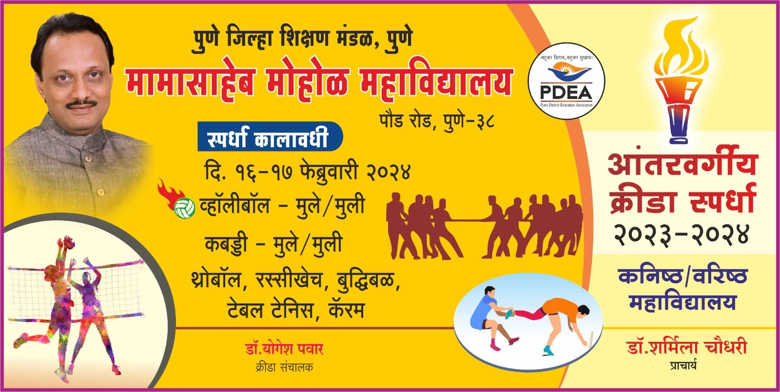 | 9 | Intercollegiate Sports Days | -- | Sports | Sports Department | Students | College | -- | Dr. Yogesh Pawar | 2024-02-16 | 08:00 AM | 2024-02-17 | 01:00 PM | -- |