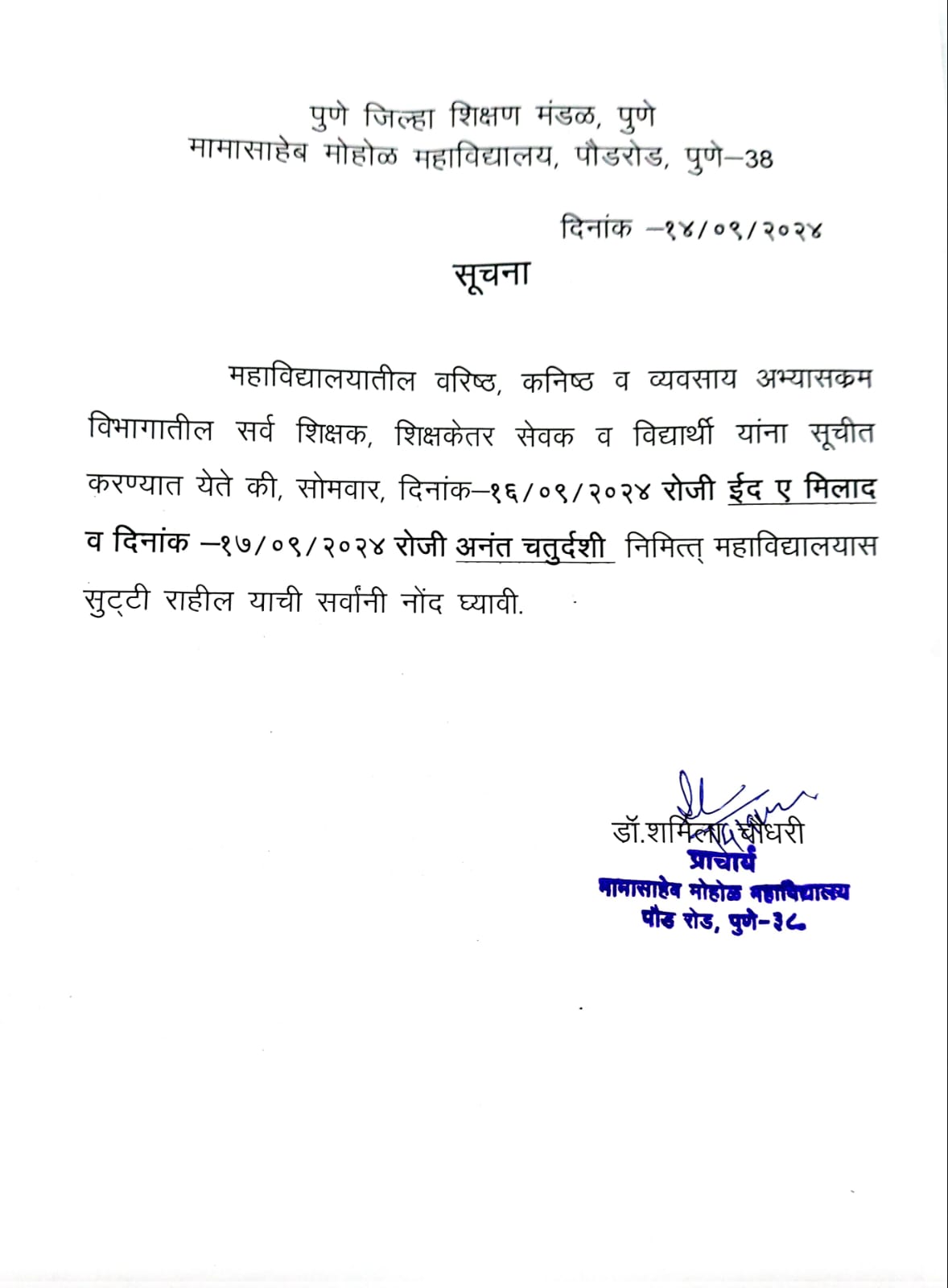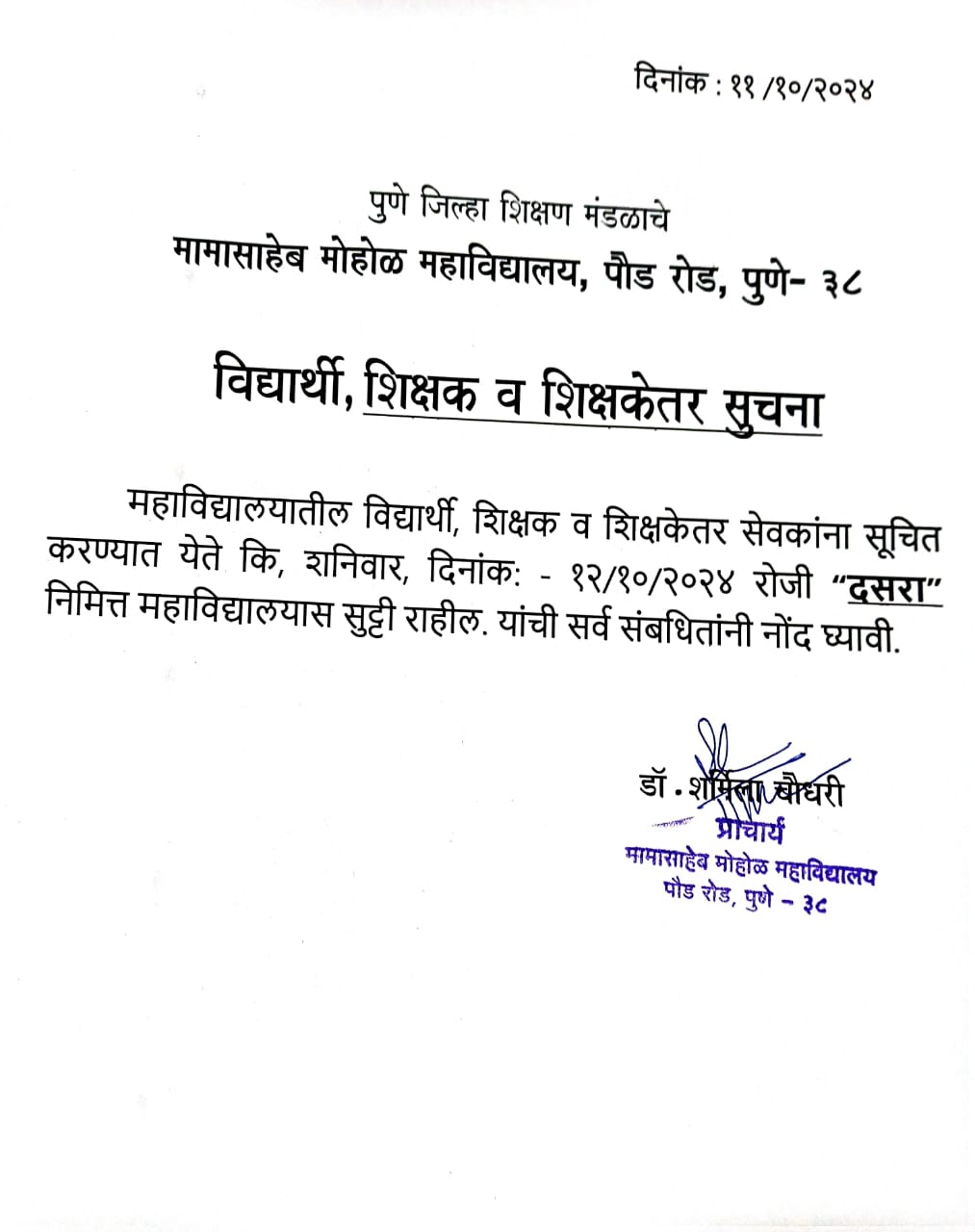 | 2023-10-10 | मामासाहेब मोहोळ महाविद्यालयाकडून सुवर्णपदकांची लूट | कु. तृप्ती माने, कु.शितल जाधव, कु.गीतांजली जगदाळे, कु.वैष्णवी बामणे व कु. महादेव वडार सुवर्णपदक मिळवले. | gymkhanna.jpeg |